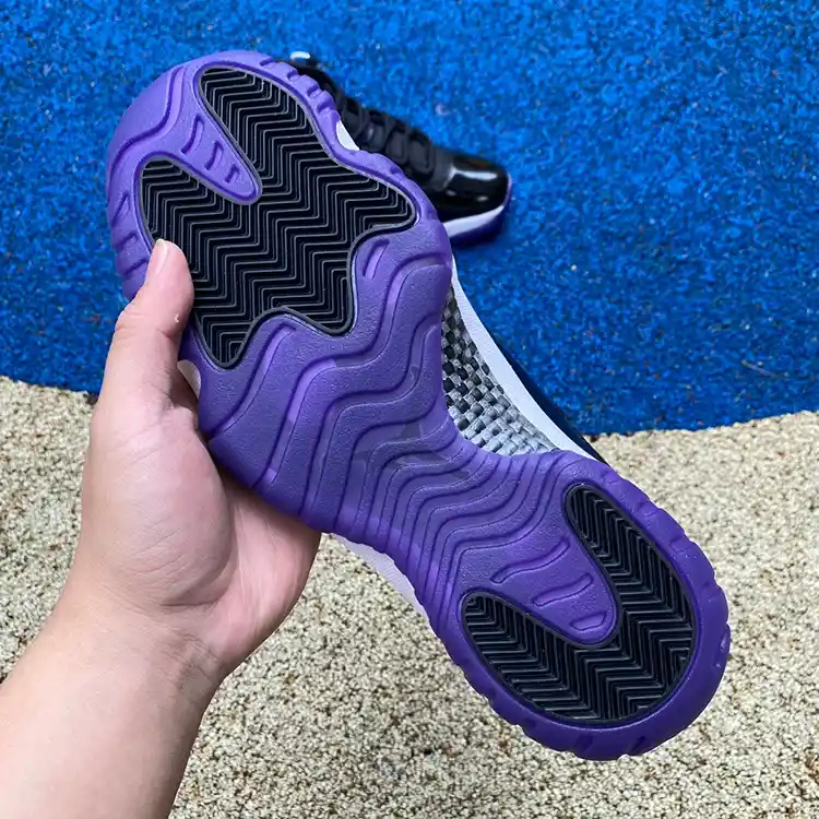 The Air Jordan 11 “Black and Purple” takes the classic AJ11 silhouette and infuses it with a bold, regal touch. Featuring a sleek black upper made of patent leather and mesh, the sneaker is elevated with striking purple accents on the Jumpman logo and outsole. This high-top sneaker combines luxurious materials with advanced basketball performance features, including a carbon fiber shank plate and full-length Air-Sole unit for unmatched comfort and support. The translucent outsole completes the design, providing durability and a stylish finish, making this sneaker a standout both on and off the court.