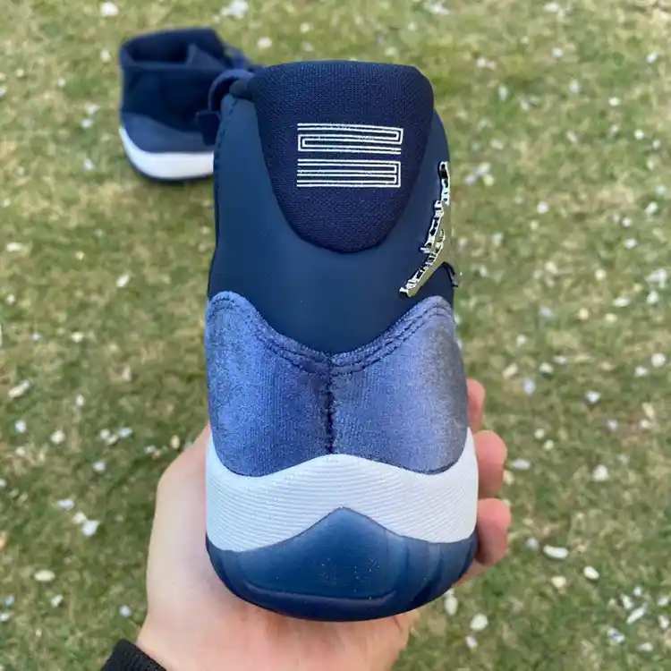The Air Jordan 11 “Midnight Navy” Women’s edition is a stunning, luxurious take on the classic AJ11 silhouette, designed specifically for women. Featuring a deep “Midnight Navy” color scheme, this sneaker stands out with its elegant velvet overlays instead of the traditional patent leather. The upper is crafted with premium nubuck, providing a smooth texture that complements the rich velvet accents. A metallic silver Jumpman logo on the collar adds a touch of sophistication, while the translucent outsole ensures durability and a stylish finish. This exclusive women’s release combines elegance with performance, making it a must-have for sneaker enthusiasts and fashion-forward individuals alike.
