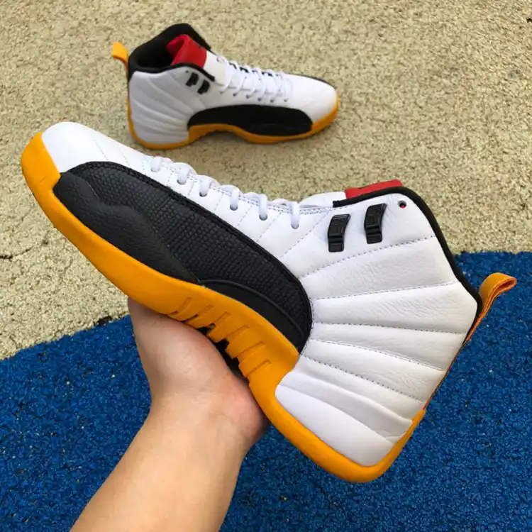 • Vibrant Yellow Accents: Bright yellow detailing on the heel tab and outsole brings energy to the shoe, adding a unique touch to the classic AJ12 design.