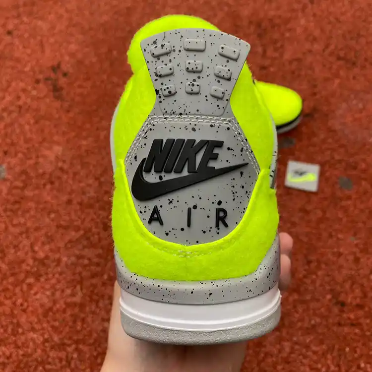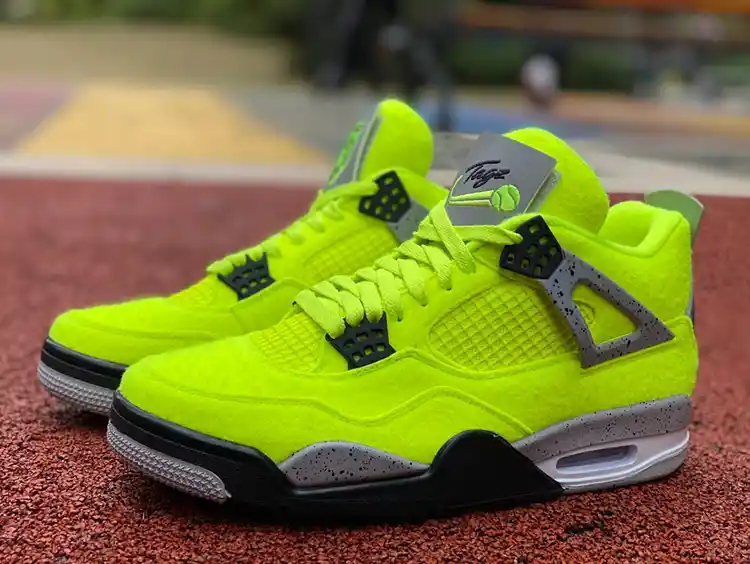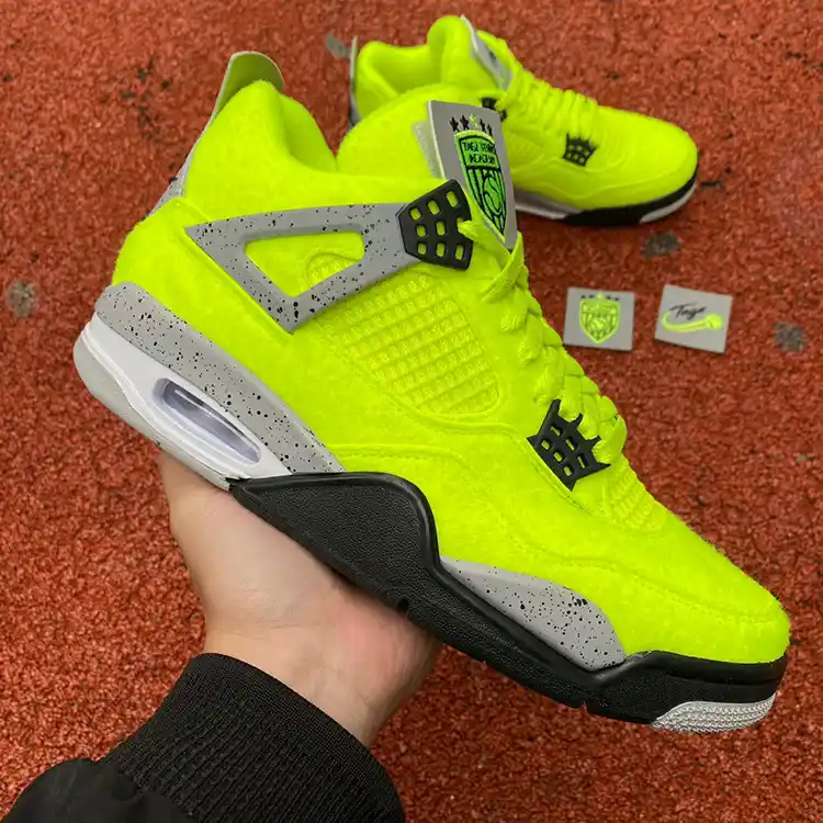- Vibrant Colorway: The Air Jordan 4 “Tagz Logo” features an eye-catching fluorescent green upper that is sure to turn heads. This bold color choice is complemented by subtle black and white accents, creating a dynamic and modern look.