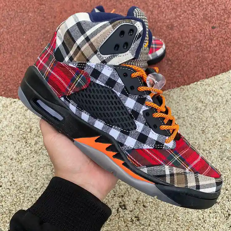 The Air Jordan 5 “Plaid” is a bold, eye-catching edition of the iconic AJ5 silhouette that merges classic design elements with a contemporary twist. This high-top sneaker features a sleek black leather upper, complemented by a striking red plaid pattern on the side panels, which adds a distinctive and fashionable flair. The midsole is done in a clean white, providing a sharp contrast and enhancing the overall design. The shoe also includes the signature AJ5 shark tooth detailing in red, paired with a translucent outsole that provides both style and superior grip. The reflective silver tongue with the Jumpman logo adds a touch of classic Jordan charm to this unique release.