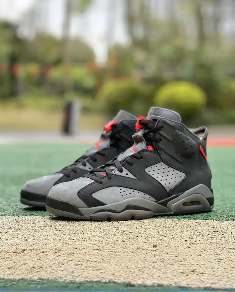 The Air Jordan 6 x PSG “Paris Saint-Germain” is a stunning collaboration between Jordan Brand and the French football club, Paris Saint-Germain. This unique edition of the AJ6 celebrates Parisian style and the legendary Air Jordan silhouette, combining the best of both worlds. Featuring a black and iron grey nubuck upper with Bordeaux accents, this sneaker has a sleek, urban feel. The PSG logo on the heel and special “PANAME” tag on the side add exclusive details that make this pair stand out. Perfect for fans of both basketball and football, the AJ6 x PSG delivers style, comfort, and performance in one iconic package.