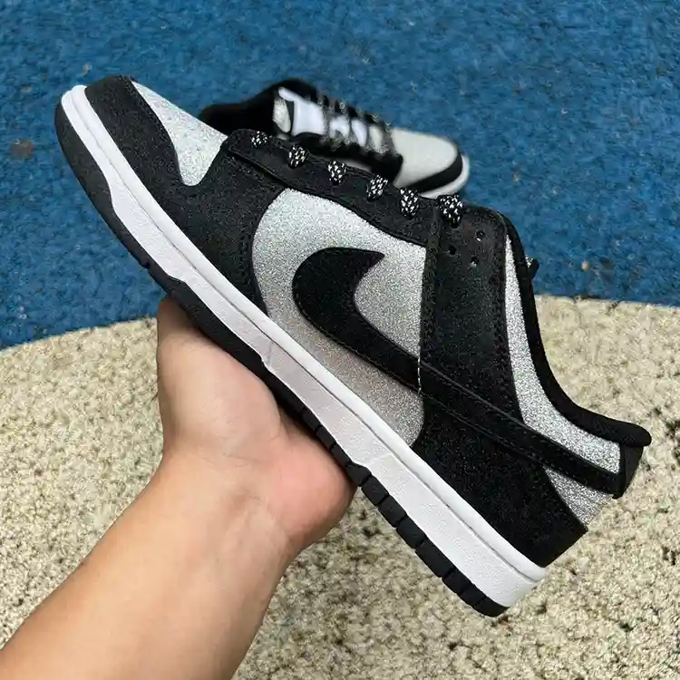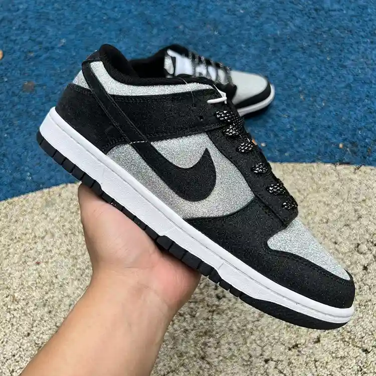 - Upper: The Dunk Low “Black/Gray Sparkle” features a smooth, black leather upper with a subtle gray sparkle finish. The shimmering details are integrated seamlessly into the design, offering a touch of sophistication without overwhelming the classic Dunk silhouette.