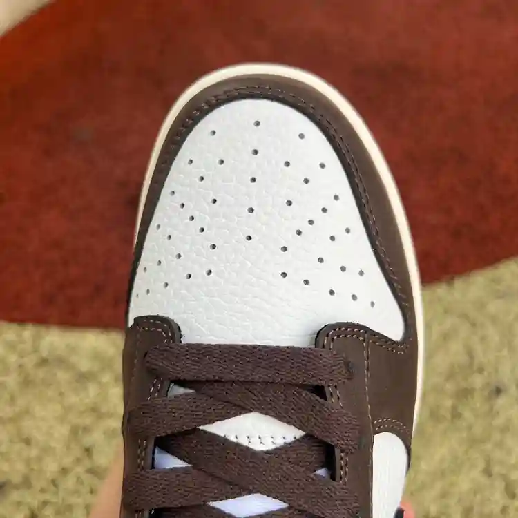 • Upper: The upper is crafted from a mix of premium leather and synthetic materials, providing a sleek look and lasting durability. The brown base is accented by contrasting black overlays and crisp white details, giving the shoe a balanced and stylish appearance.