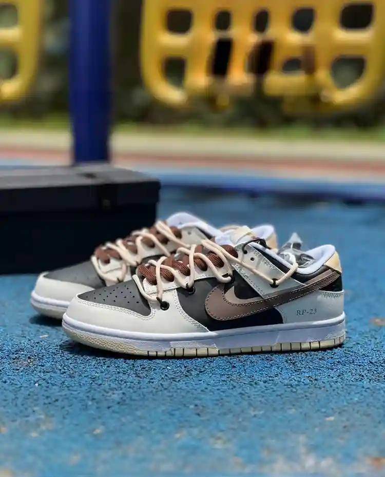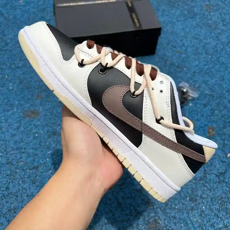 - Upper: The Nike Dunk Low “Chestnut” showcases a premium leather upper with a unique colorway combining shades of rich chestnut brown with contrasting black and creamy beige accents. The textural contrasts and layered design elements add depth and dimension to the sneaker.