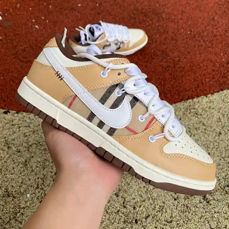 - Burberry-Inspired Design: The sneaker features a pattern reminiscent of Burberry’s iconic check, adding a touch of luxury to the classic Dunk Low silhouette.
