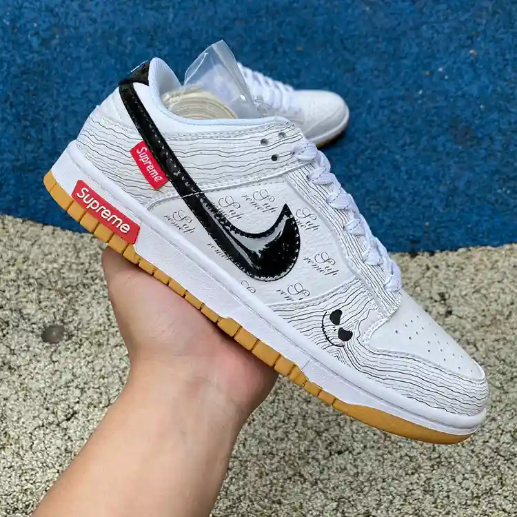 - Design: The Nike Dunk Low x Supreme stands out with its minimalist yet bold design. The clean white and black colorway is timeless, while the gum rubber outsole adds a vintage touch. The Supreme logo on the tongue and insole adds an exclusive edge to this already iconic sneaker.