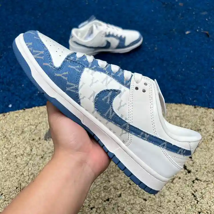 Care Instructions: To keep your Nike Dunk x MLB New York Yankees looking fresh, clean the upper with a soft, damp cloth to remove any dirt or stains. For best results, spot clean the navy blue accents with a gentle leather cleaner. Avoid submerging the sneakers in water and keep them away from harsh chemicals to maintain their pristine appearance.