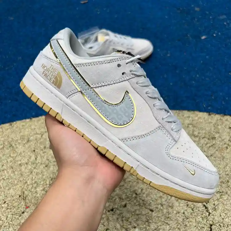 Care Instructions: To maintain the quality of your Nike Dunk x The North Face sneakers, clean the leather upper with a soft, damp cloth. Use a gentle cleaner for the gold accents to avoid discoloration. For the weather-resistant overlays, a mild soap and water solution can be used. Avoid submerging the shoes in water or using harsh chemicals.